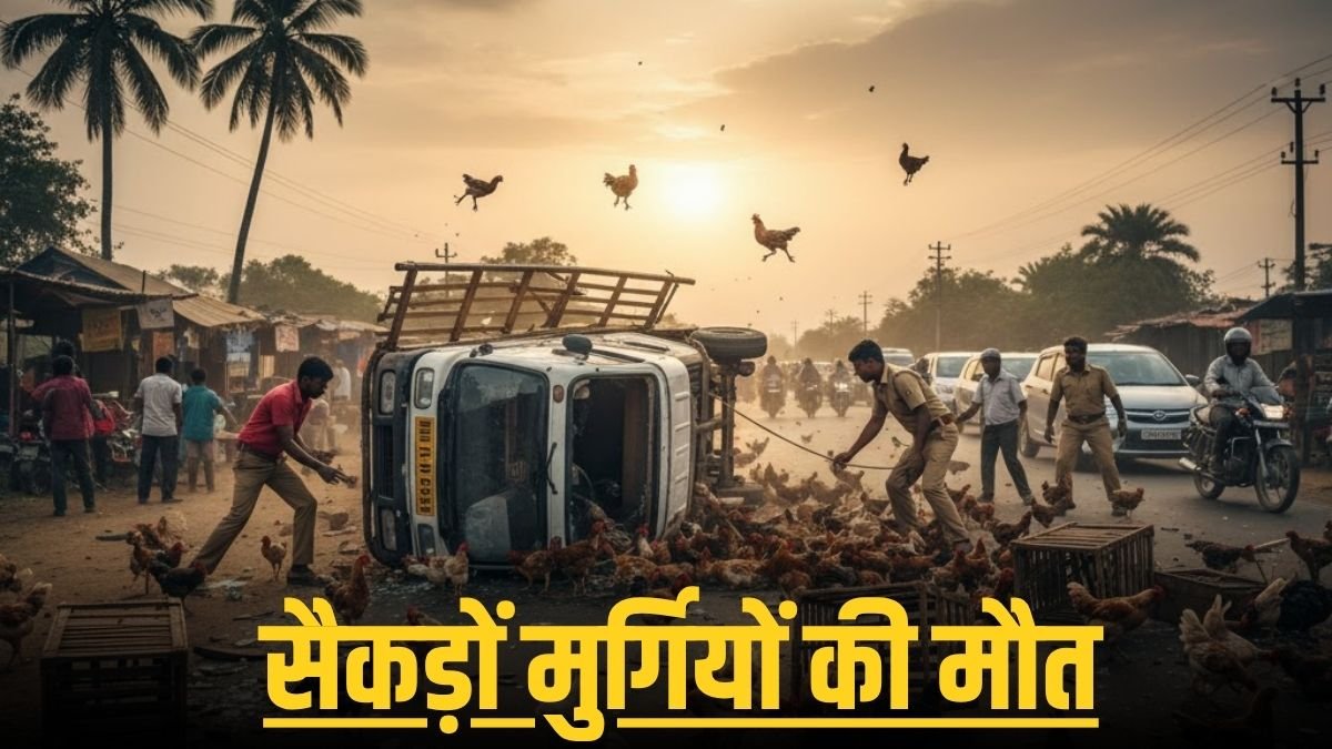 पिकअप में भरी सैकड़ों मुर्गियां मौके पर ही मर गईं, जिससे सड़क पर अफरातफरी मच गई।