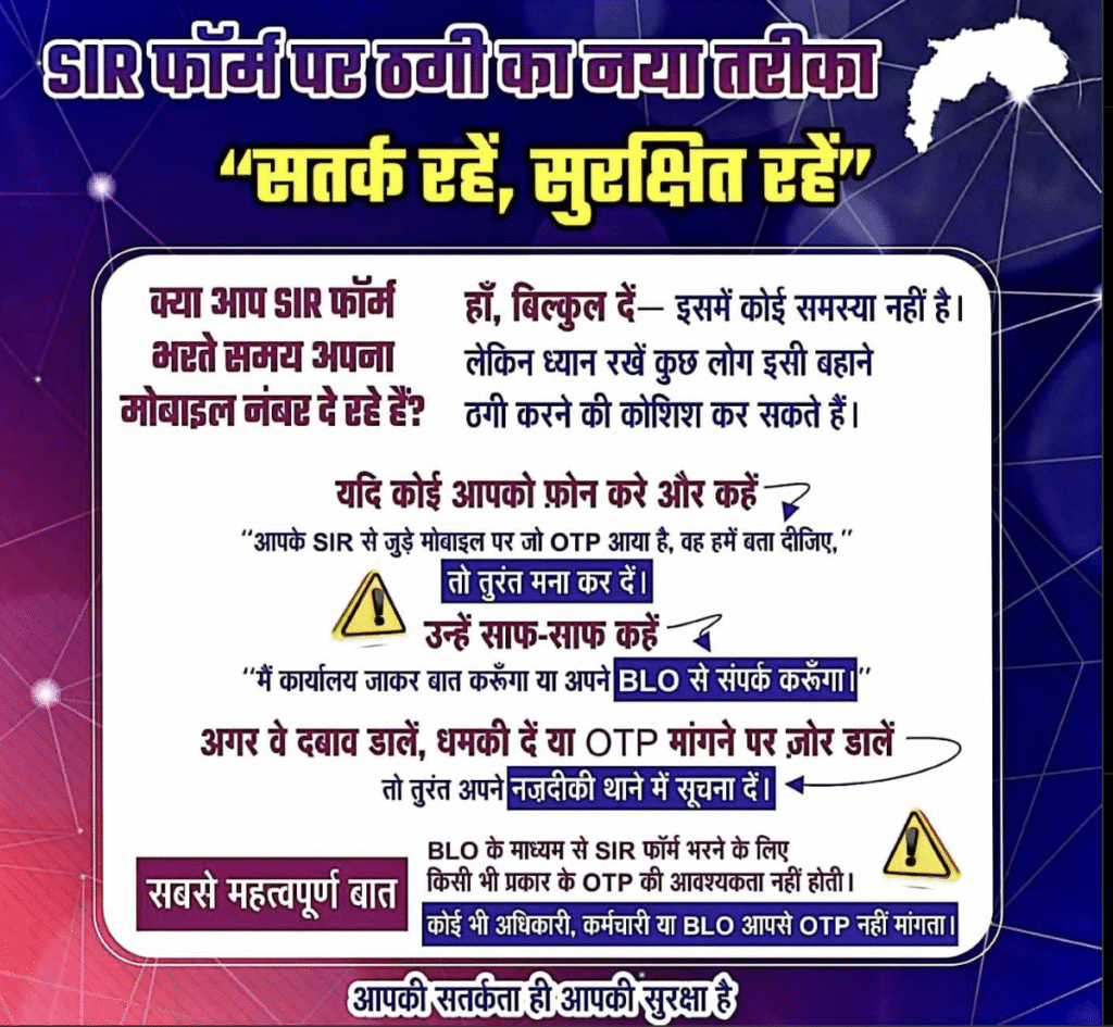 भोपाल में SIR फॉर्म के नाम पर स्कैमर्स ने घोटाला चालू कर दिया था। जिसके तहत वह फॉर्म जमा कर चुके लोगों से या तो OTP मांग रहे थे, या फिर उन्हें SIR.apk की वायरस वाली फाइल भेजते हैं। जिसे डाउनलोड करते ही,वोटर्स की संवेदनशील जानकारी जैसे कॉन्टैक्ट, फोटो, SMS और यहां तक ​​कि बैंकिंग डिटेल भी उनके पास चली जाती है। ऐसे में साइबर अपराध शाखा पुलिस ने निवासियों से सतर्क रहने और दूसरों को ऐसी फ्रॉड की गतिविधियों के बारे में सूचित करने का आग्रह किया है। किसी भी साइबर संबंधी घटना की स्थिति में, पीड़ित साइबर अपराध हेल्पलाइन 9479990636 या राष्ट्रीय हेल्पलाइन 1930 पर संपर्क कर सकते हैं, या www.cybercrime.gov.in पर शिकायत दर्ज करा सकते हैं।