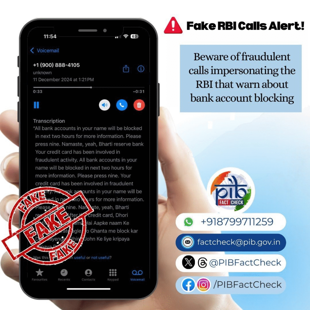 PIB Fact Check ने स्पष्ट किया है कि RBI कभी भी वॉयसमेल के जरिए चेतावनी जारी नहीं करता, न ही किसी अनजान नंबर से आने वाली कॉल पर ग्राहक विवरण की पुष्टि करने को कहता है। धोखेबाज़ अक्सर बैंक या सरकारी एजेंसी के नंबर को स्पूफ करते हैं, जिससे कॉल वास्तविक लगती है। जैसे ही कोई व्यक्ति इस संदेश पर विश्वास कर कॉल बैक करता है या मांगी गई जानकारी दर्ज करता है, ठग उसे ‘वेरिफिकेशन’ के नाम पर संवेदनशील डेटा देने के लिए मजबूर करते हैं। कई मामलों में लोग कुछ ही मिनटों में अपनी पूरी जमा-पूंजी गँवा बैठते हैं।