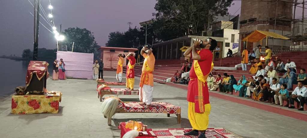 भव्य आरती में स्थानीय कलाकारों ने गंगा महिमा पर आधारित भजन प्रस्तुत किए।